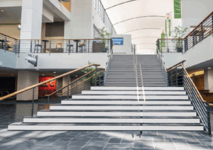 Located at street level, the staircase leads directly to the food court. ACVS registration is immediately to the left, with the main entrance to Exhibit Hall C visible in the photo, ensuring your branding is seen by attendees as they navigate the event and head to the show floor.