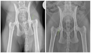 Figure 1. Two examples of a femoral capital physeal fracture (FCPF) in different cats. The image on the left shows a displaced fracture outlined by the green arrow, which is directly contrasting to the normal femoral head and its association with the neck of the femur on the other side. The image on the right also shows a FCPF; however, this one is not displaced but is able to be discerned as fractured due to the thicker lucent (black) line outlined by the green arrow, especially when compared to the other side.