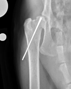 Figure 2. An example of a femoral capital physeal fracture reduced and stabilized using pins.