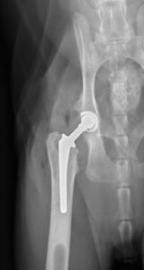 Pets undergoing THR have an excellent prognosis with regard to both comfort and mobility. As the joint itself is replaced, this allows normal hip range of motion, limb length and muscling to be maintained. Intense post-operative care is required – usually 8-12 weeks of strict rest with avoidance of slippery floors and potentially support while walking (such as the use of slings) for the first few weeks. The implants used to replace the joint, similar to a surgical repair of the fracture, also have the potential for complications, such as dislocation of the new hip joint, fracture of the bone surrounding the implant, and implant-associated infection. Therefore, as above, strict adherence to post-operative recommendations is warranted to mitigate these risks.
